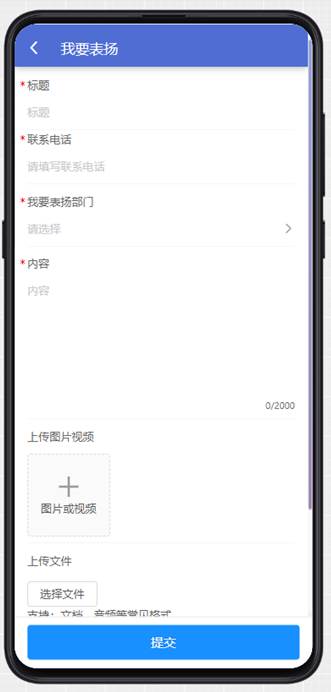 师生可在该模块提出自己要表扬的内容;系统中姓名和单位为默认项,需师生填写表扬的标题、本人联系电话,内容需要详细描述自己的表扬详情,可上传相关图片视频或文件作为附件,最后选择是否匿名。填写完成后点击“提交”按钮即可提交表扬。