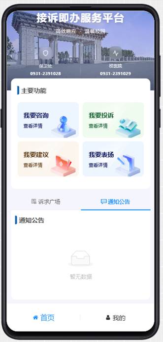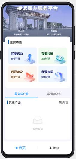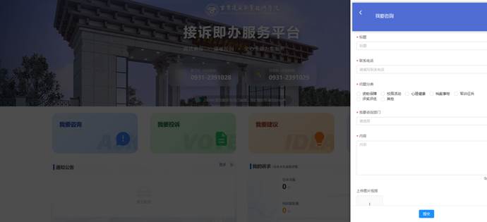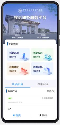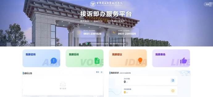 甘肃建筑职业技术学院“接诉即办服务平台”首页菜单共设4个模块;电脑端与手机端相同。具体功能如下: