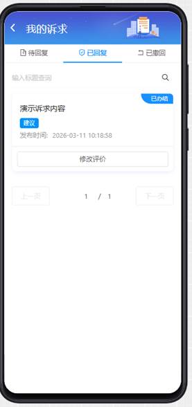 评价:师生可对已回复的诉求承办单位办理诉求的情况进行评价,可选择1-5星满意度评价(分别为:不满意、不太满意、一般、比较满意、很满意)。同时,可进行文字评价。