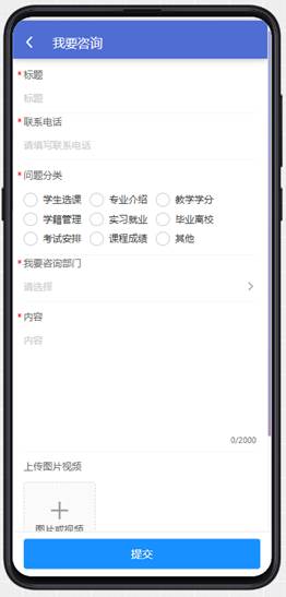 师生可在该模块提出自己的要咨询的内容;系统中姓名和单位为默认项,需师生填写咨询的标题、本人联系电话,内容需要详细描述自己的咨询详情,可上传相关图片视频或文件作为附件,最后选择是否匿名。填写完成后点击“提交”按钮即可提交咨询。